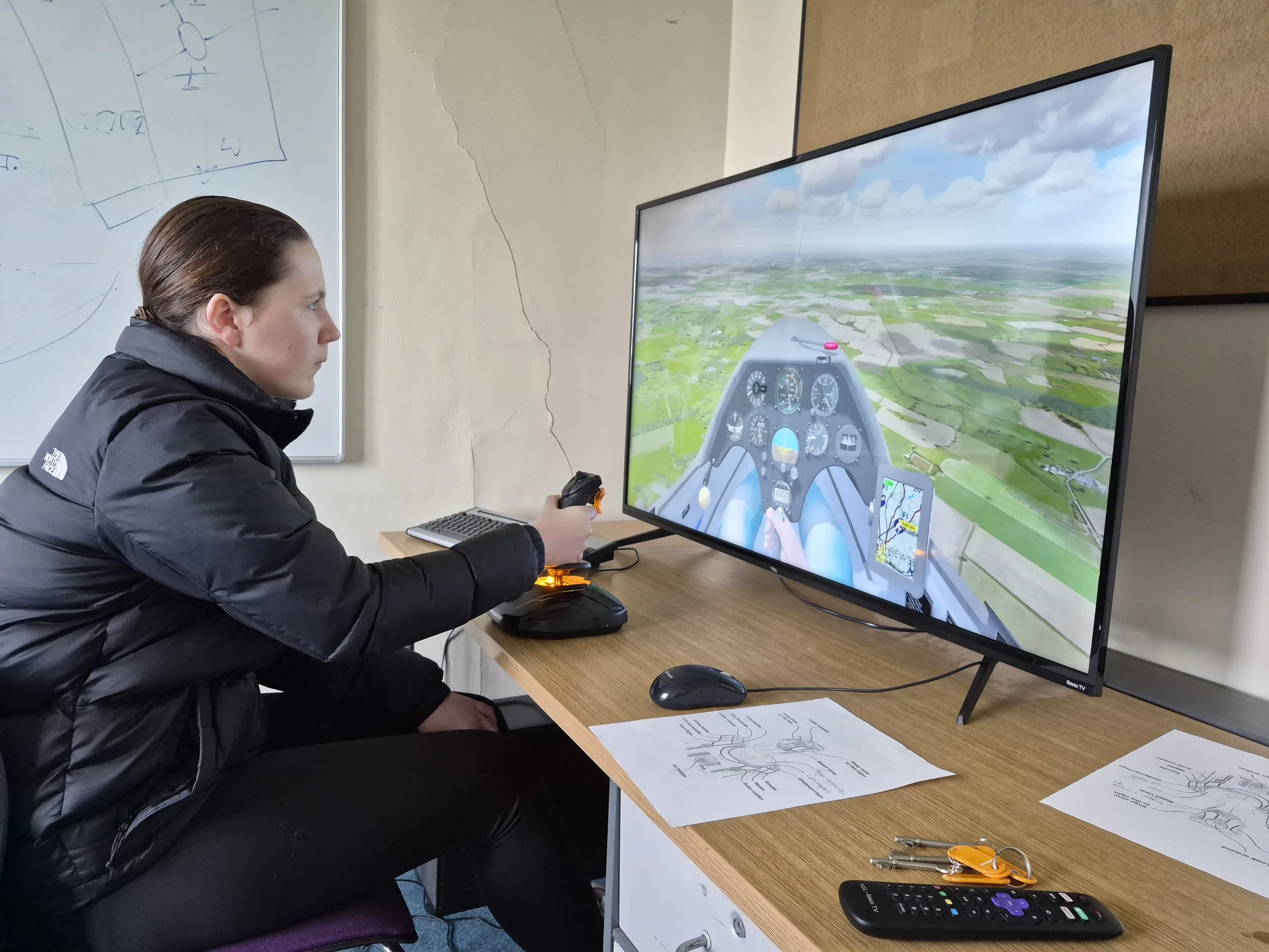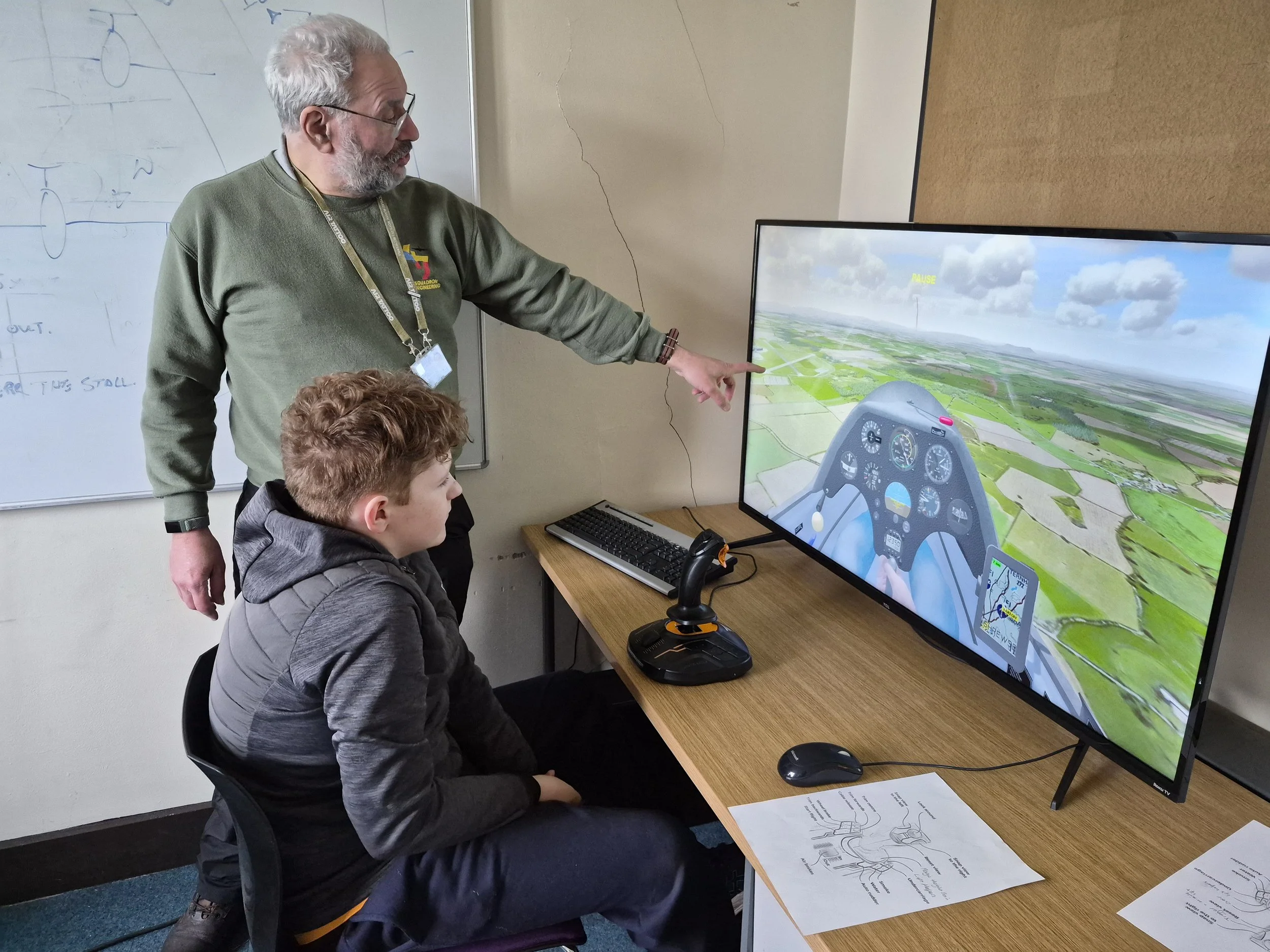 We were pleased to welcome new MEF students today, Clara and Joe, both of whom are aircraft technician apprentices at Cosford. With the prospect of flying looking slim to absolute jack, fellow Cosford recruit and instructor Brad took them onto the simulator to introduce them to the basics of gliding. After finishing off taping R66’s wings, they were joined by Ben, who after a session on the basic effects of controls with Brad, was talked through landing a glider by Wing Commander Colin… word on the street is he’s quite the natural.