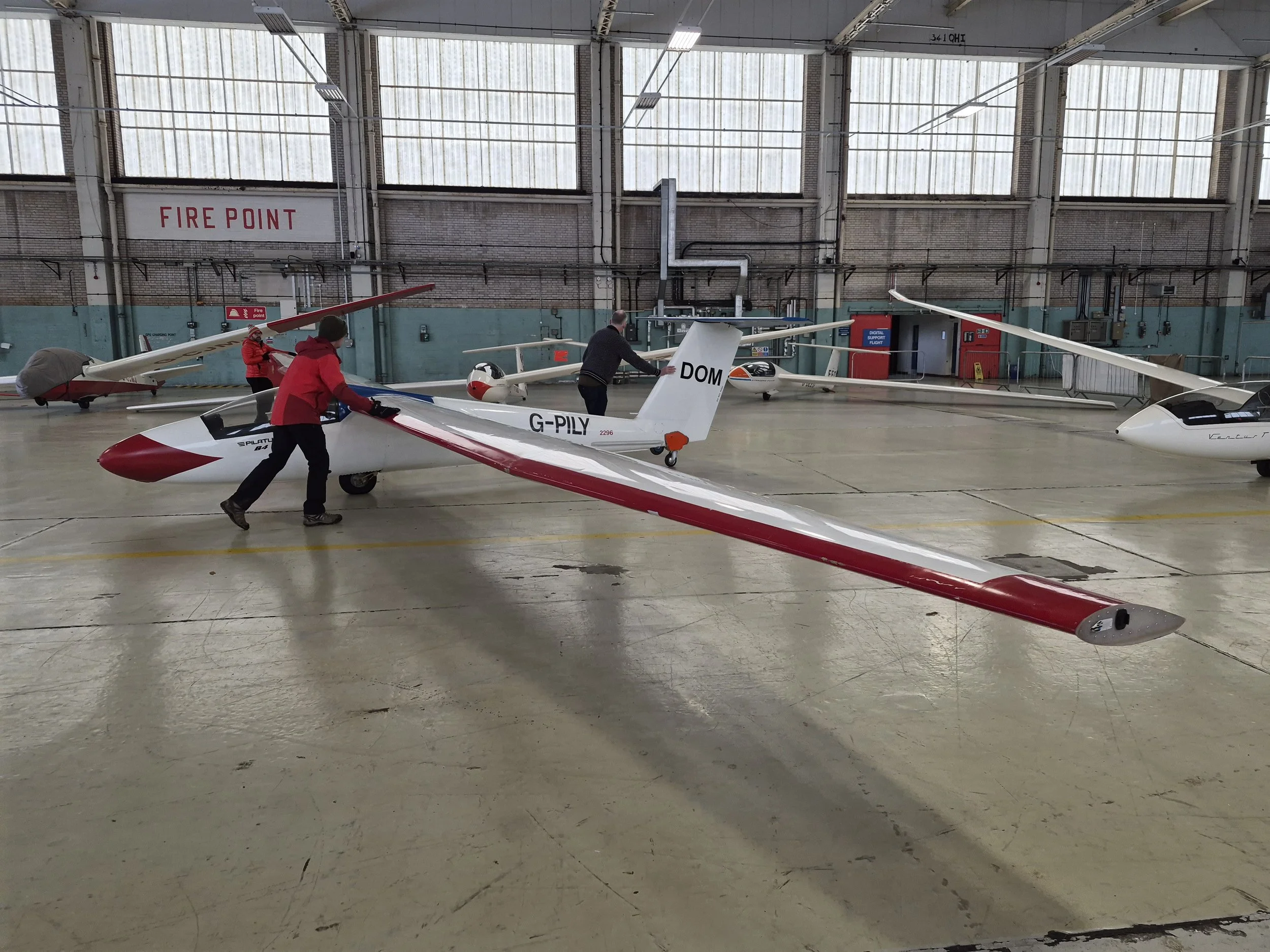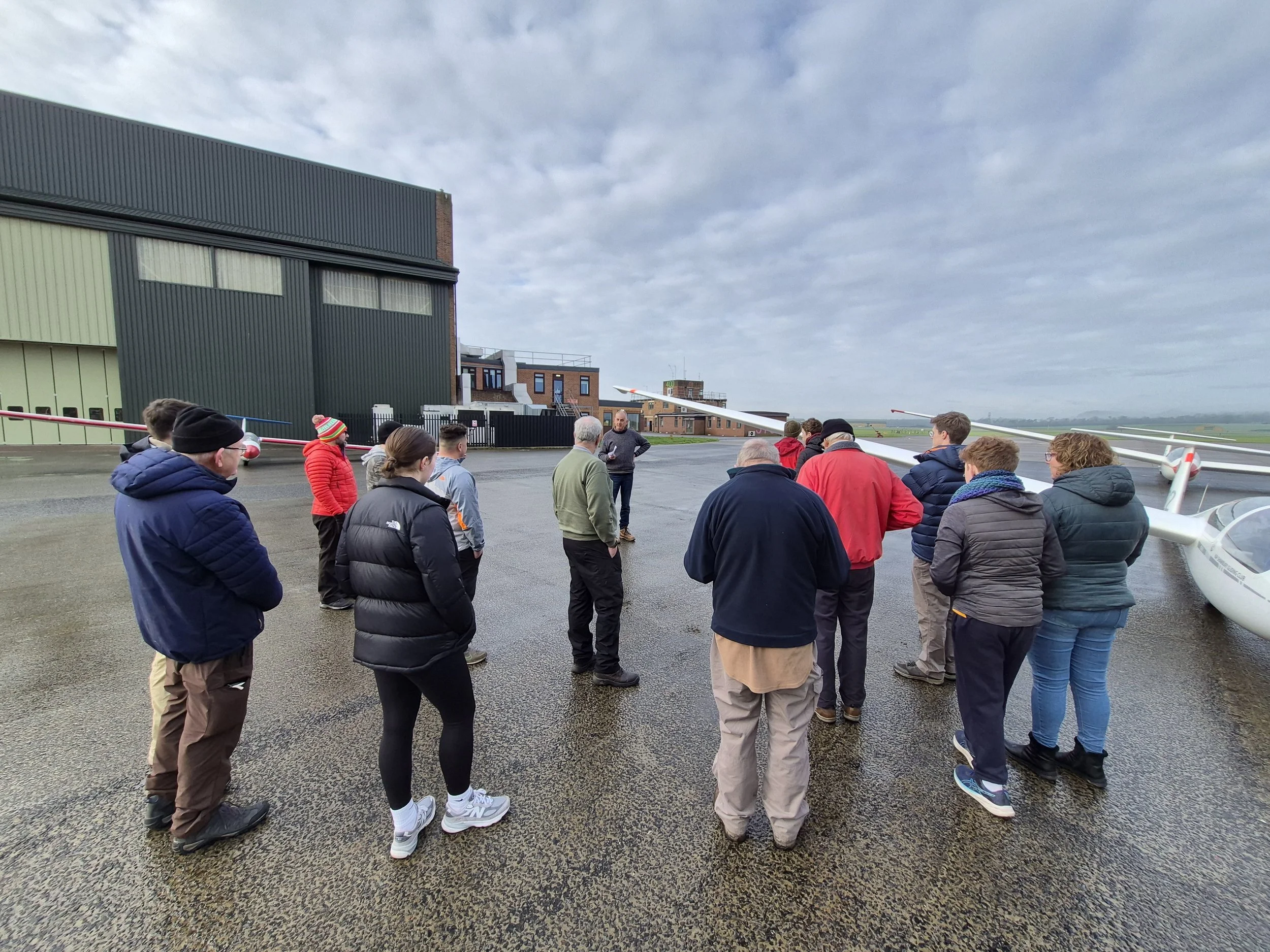 Despite arriving at an airfield blanketed in fog, Dr Will was leading the charge of the optimists, encouraging gliders and tugs to be DI’d and taken out the hangar so we could fly before the forecasted front was due to pass in the early afternoon. With the fog lifting, the signs were taken out; rather frustratingly though, the fog had decided not to lift all that much. With low cloud looming over us, duty instructor Matt rounded the brigade for morning brief.