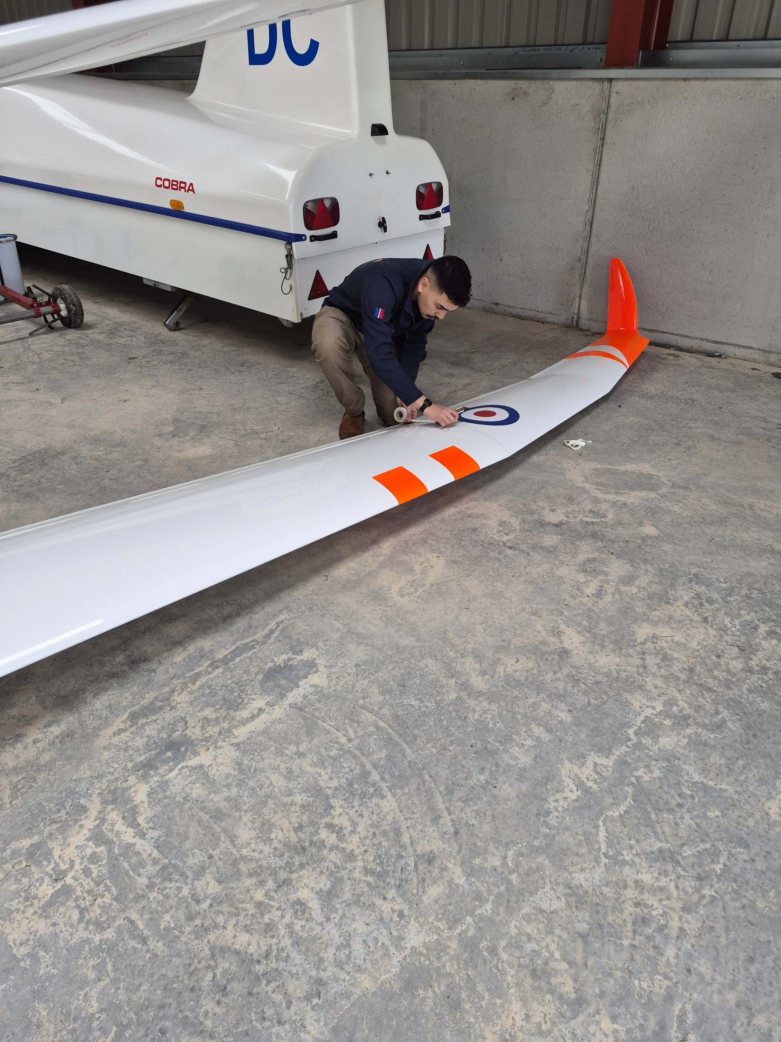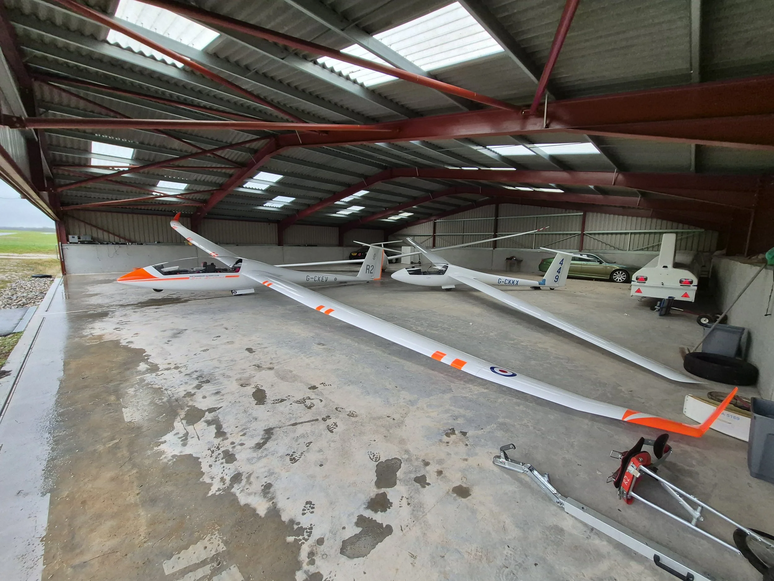 Not long after our arrival and after only a couple of flights, a band of rain soon halted flying. A brief ease in the rain however, soon provided the opportunity to get the wings on R2, and after rounding up those too slow to escape our call for aid, there were soon enough bods to rig. With the wings on and the rain becoming more relentless again, R2 was briskly hangered and the remainder of the rig completed in there.