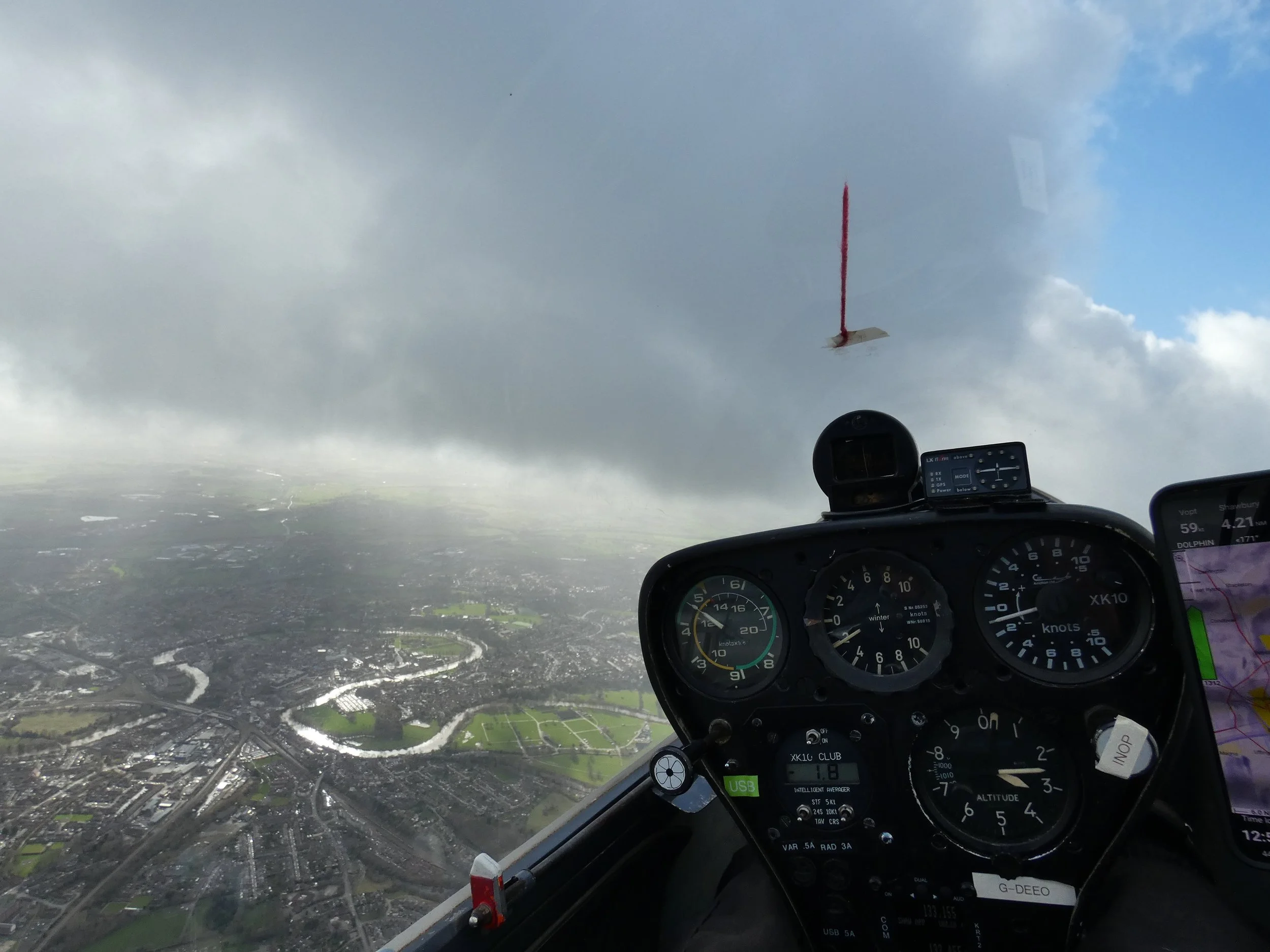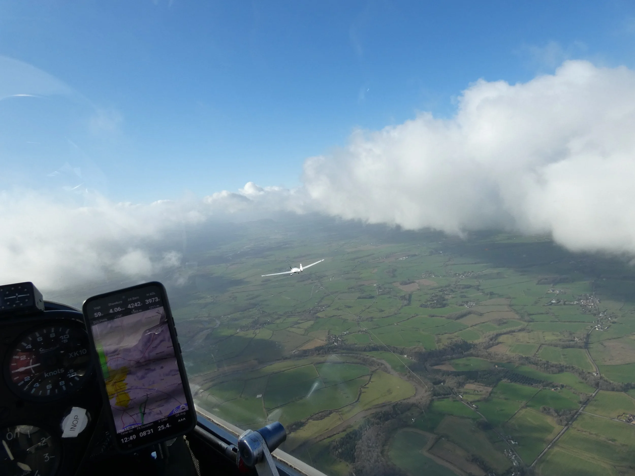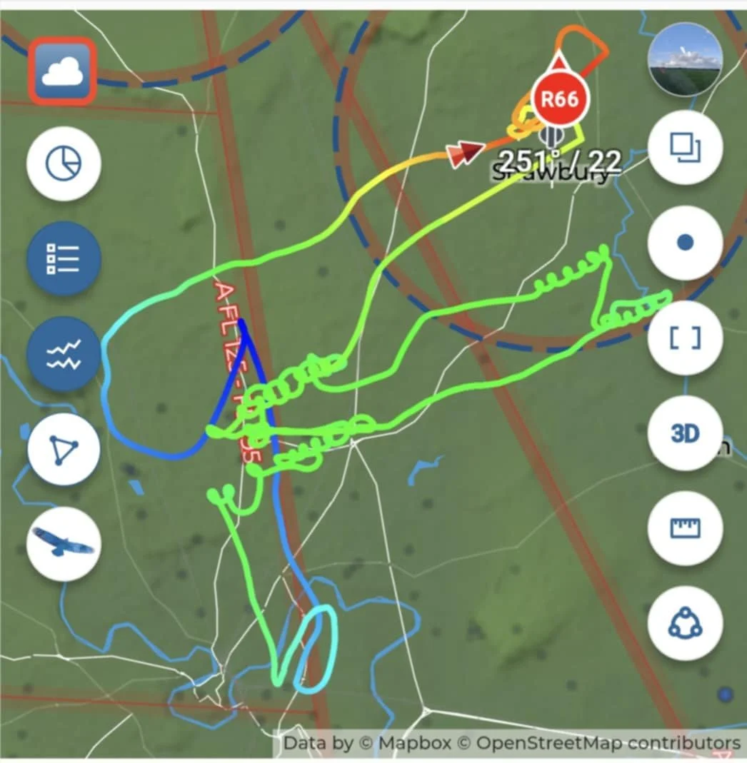 Our new met professor, Will, was next up in R66... a nice change of scenery for him compared to repairing its trailer’s interior. Sadly, the cloud was too low for him to connect with the wave. Sounds like another weather app is in need of downloading! An hour later, the Colonel braved the increasing winds as he creaked and squeaked into EEO, taking advantage of the breaking cloud cover, punching through to 4000ft. Having contacted the wave, he enjoyed a 50-minute saunter over Shrewsbury before returning to Earth, with a sporting approach.